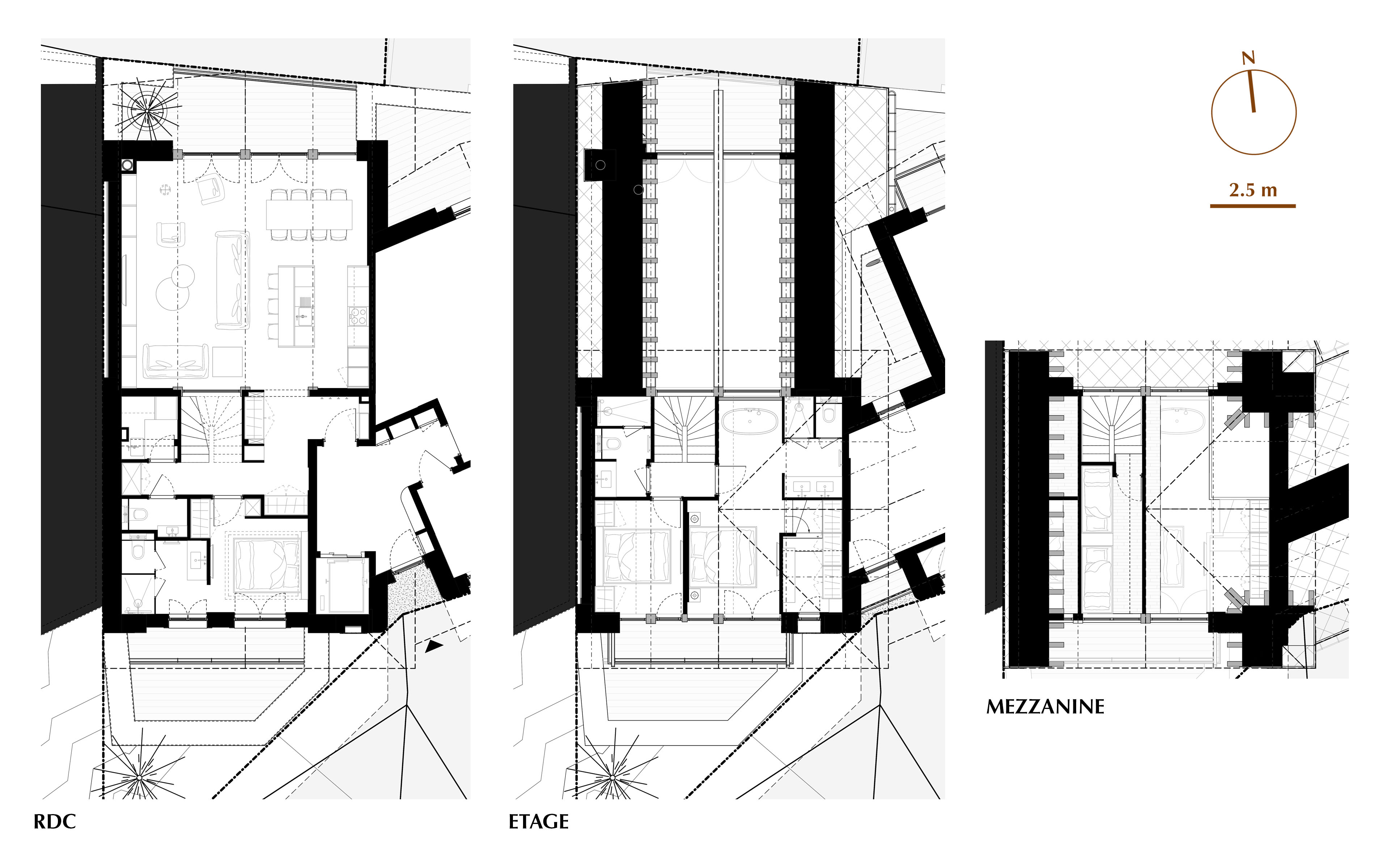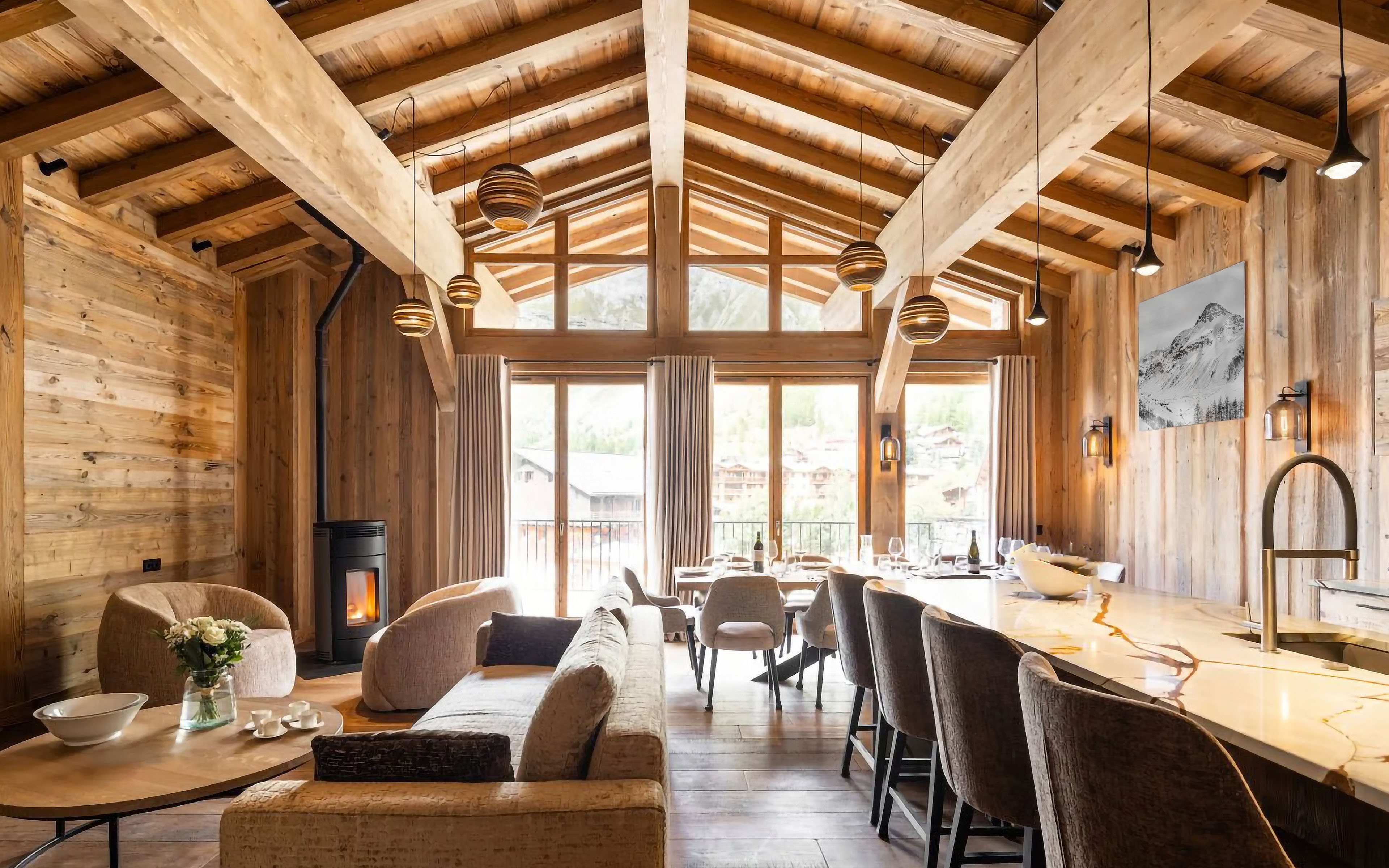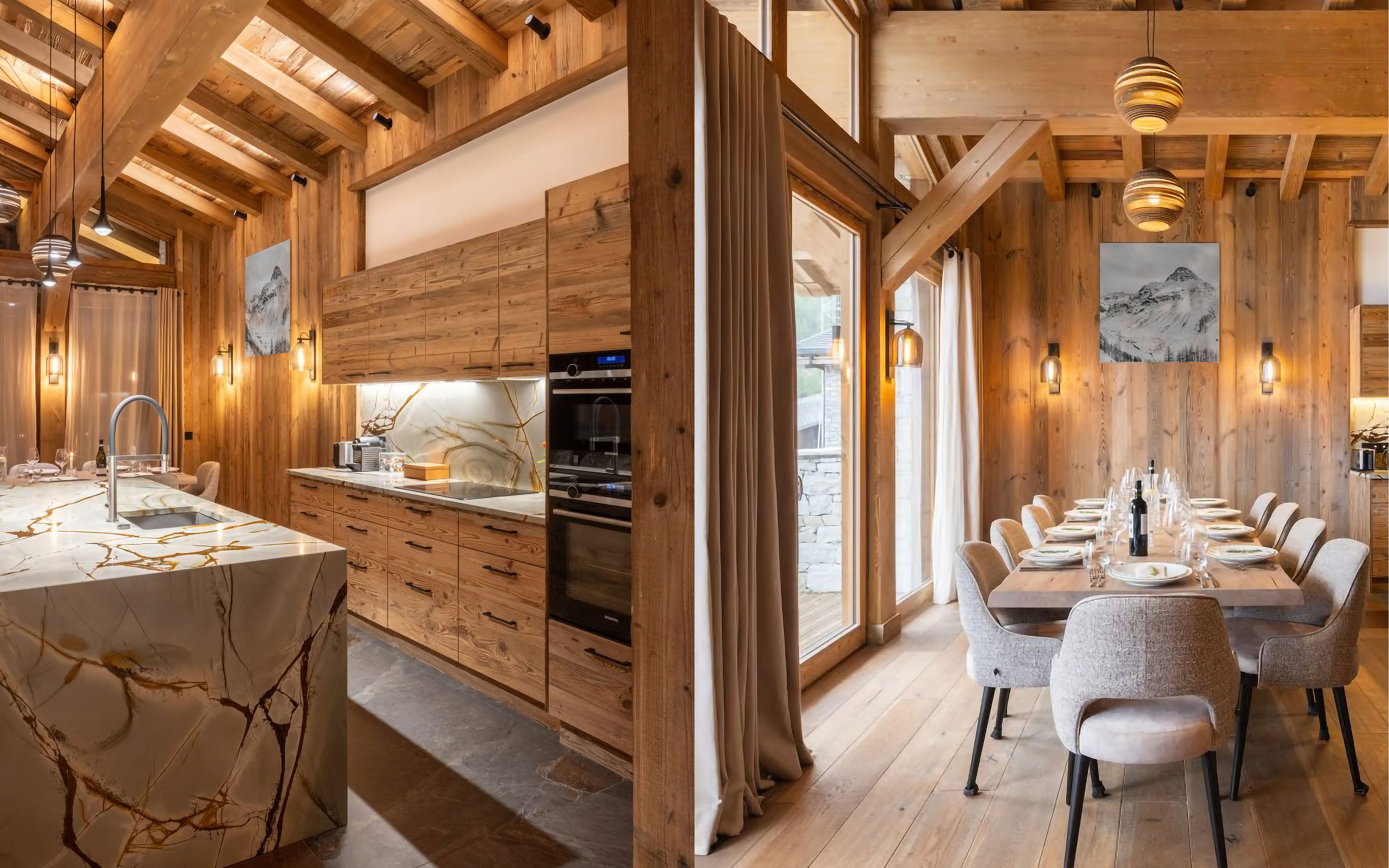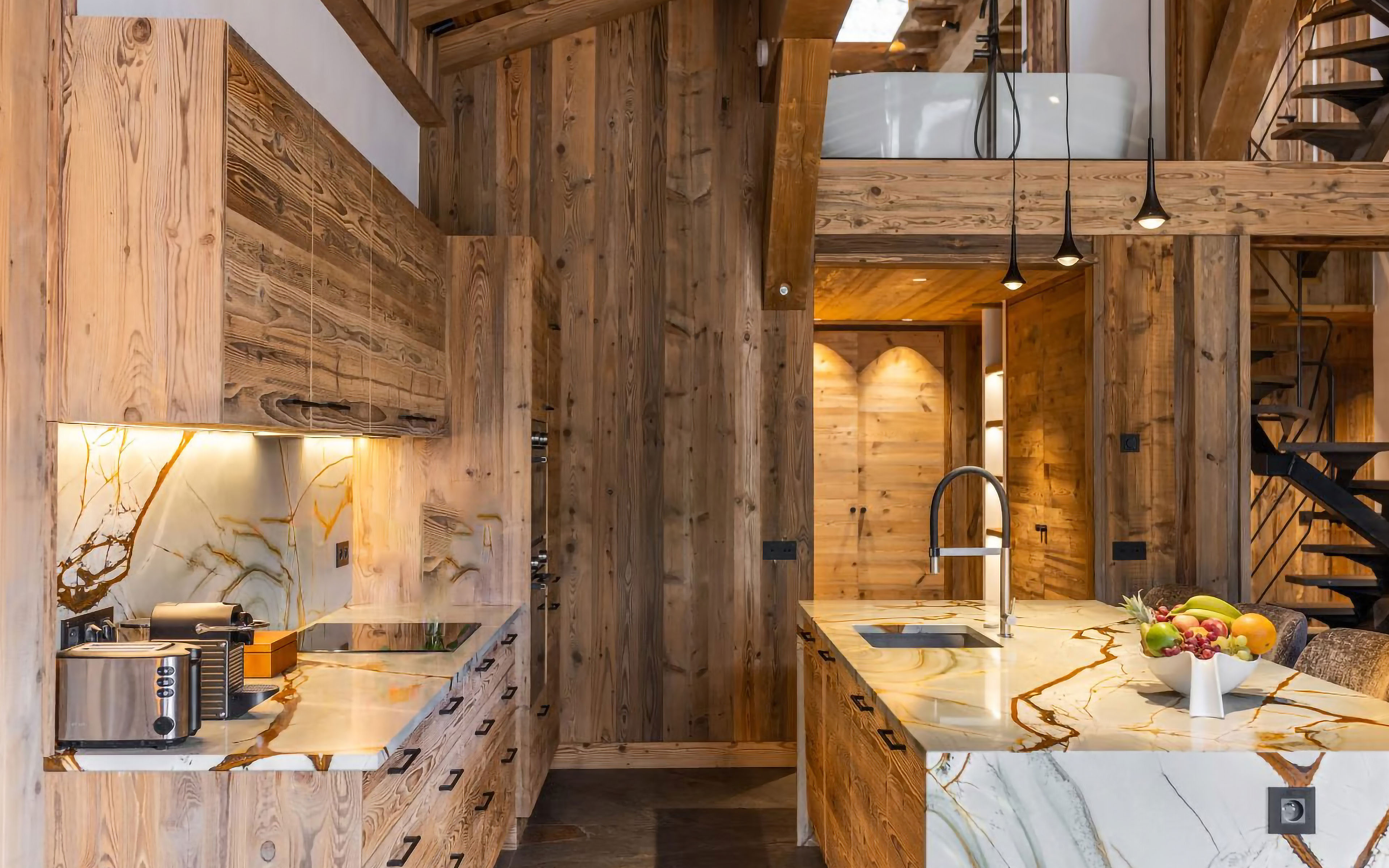 Dans la copropriété des Bosses à Val d’Isère, ce duplex avec mezzanine se distingue par ses volumes généreux et une architecture qui joue habilement avec la transparence entre les niveaux, offrant une sensation d’espace amplifiée. Chaque détail a été pensé sur mesure : un escalier sculptural en acier, des salles de bains raffinées en pierre naturelle et une cuisine en marbre spécifique.