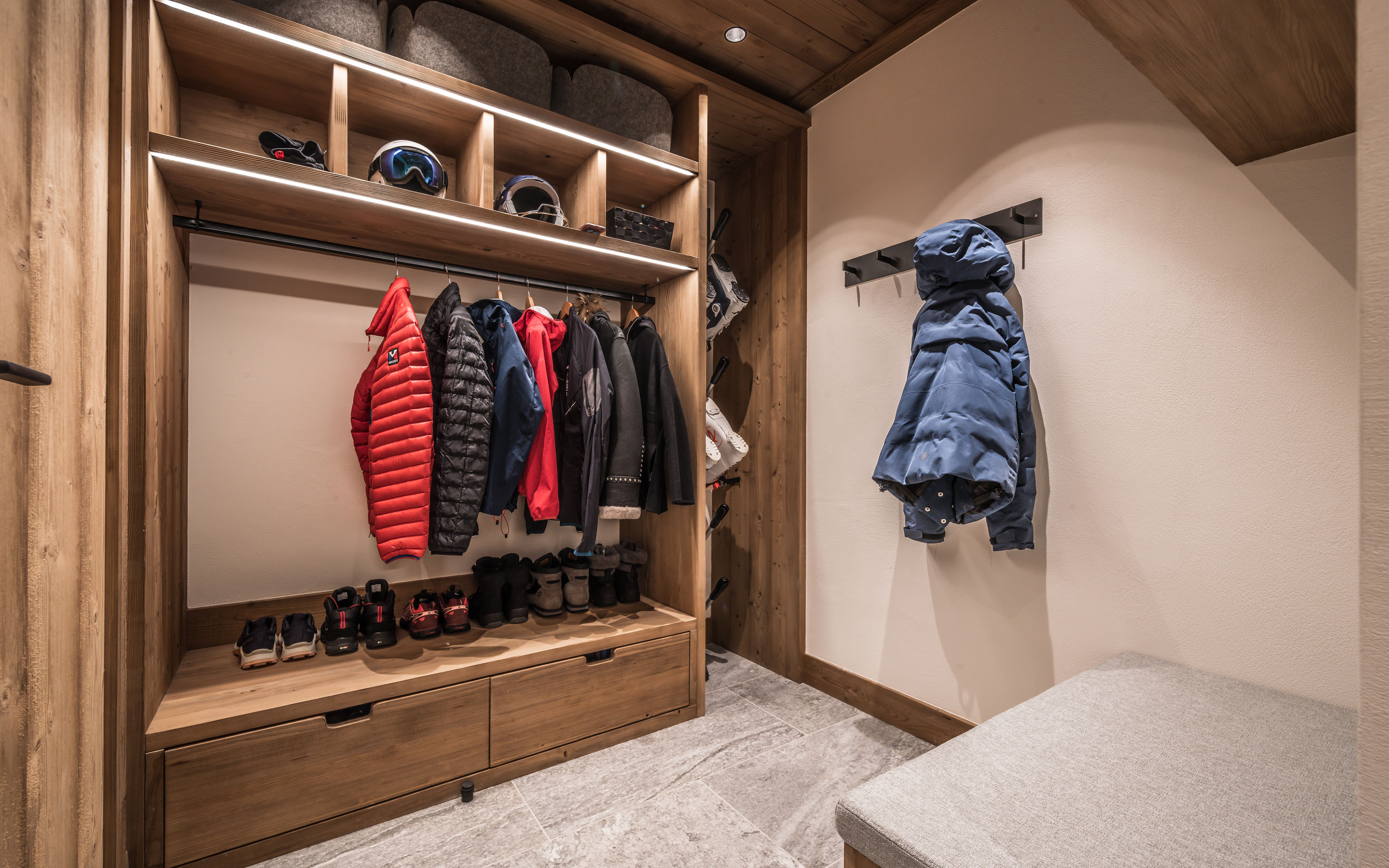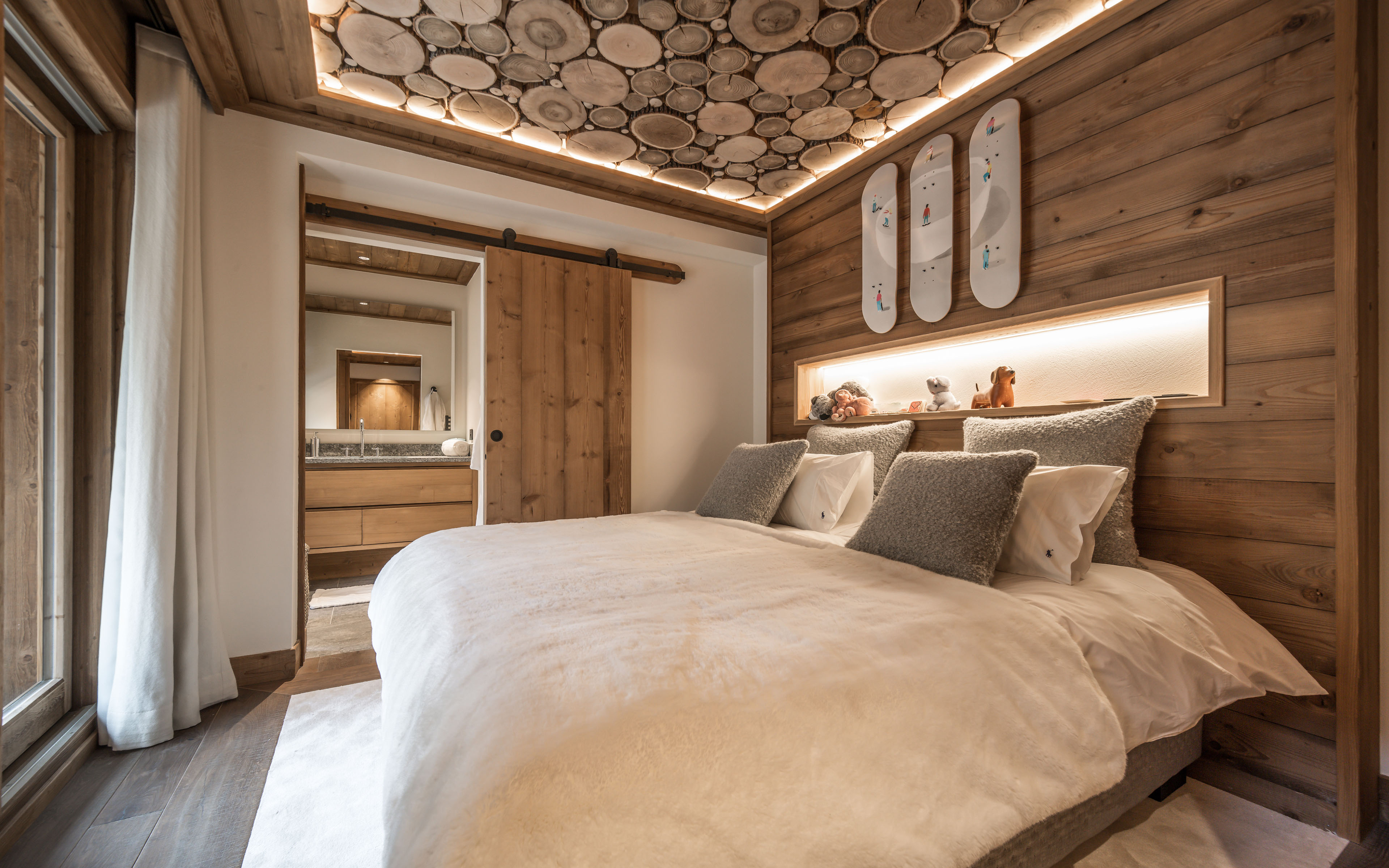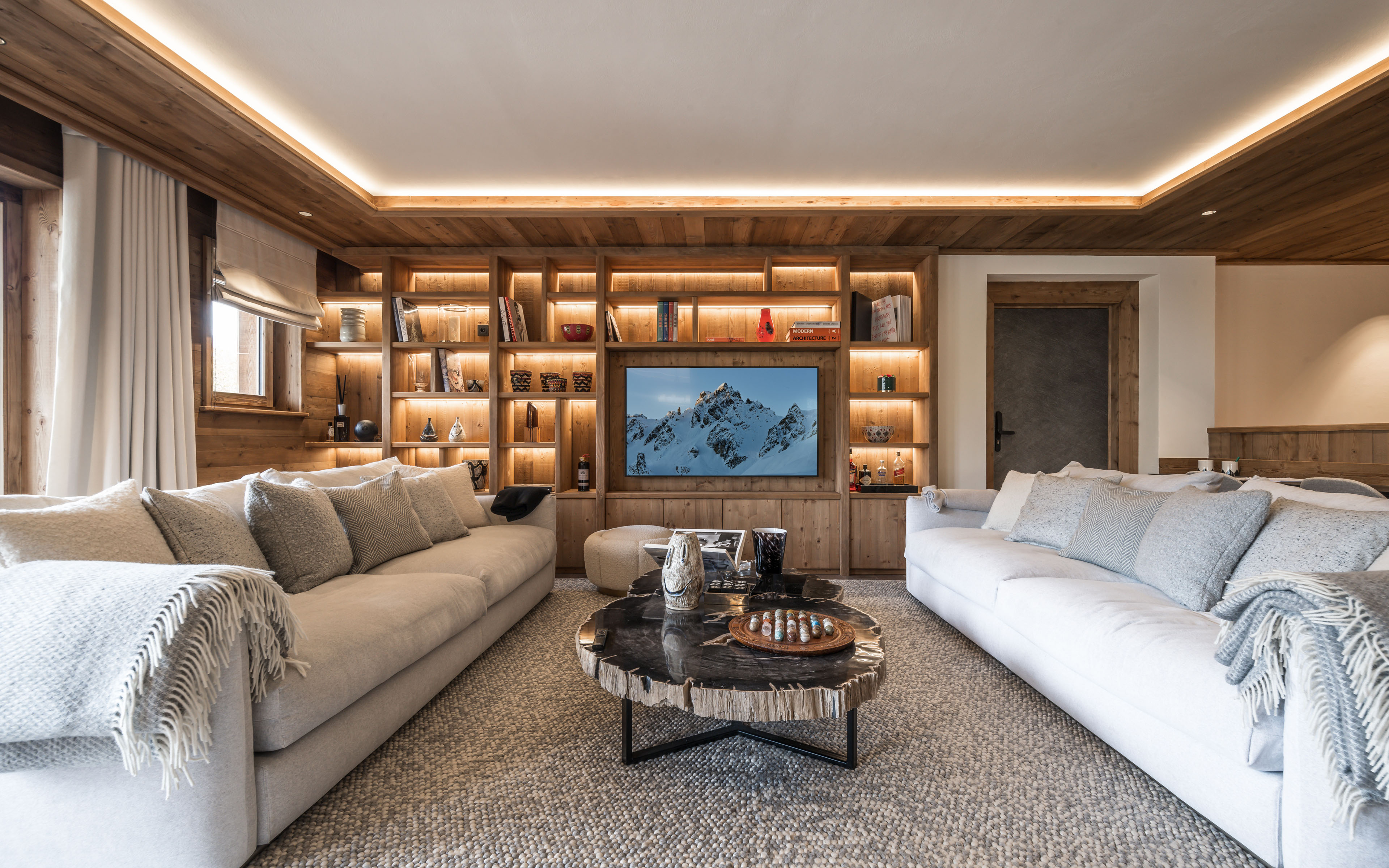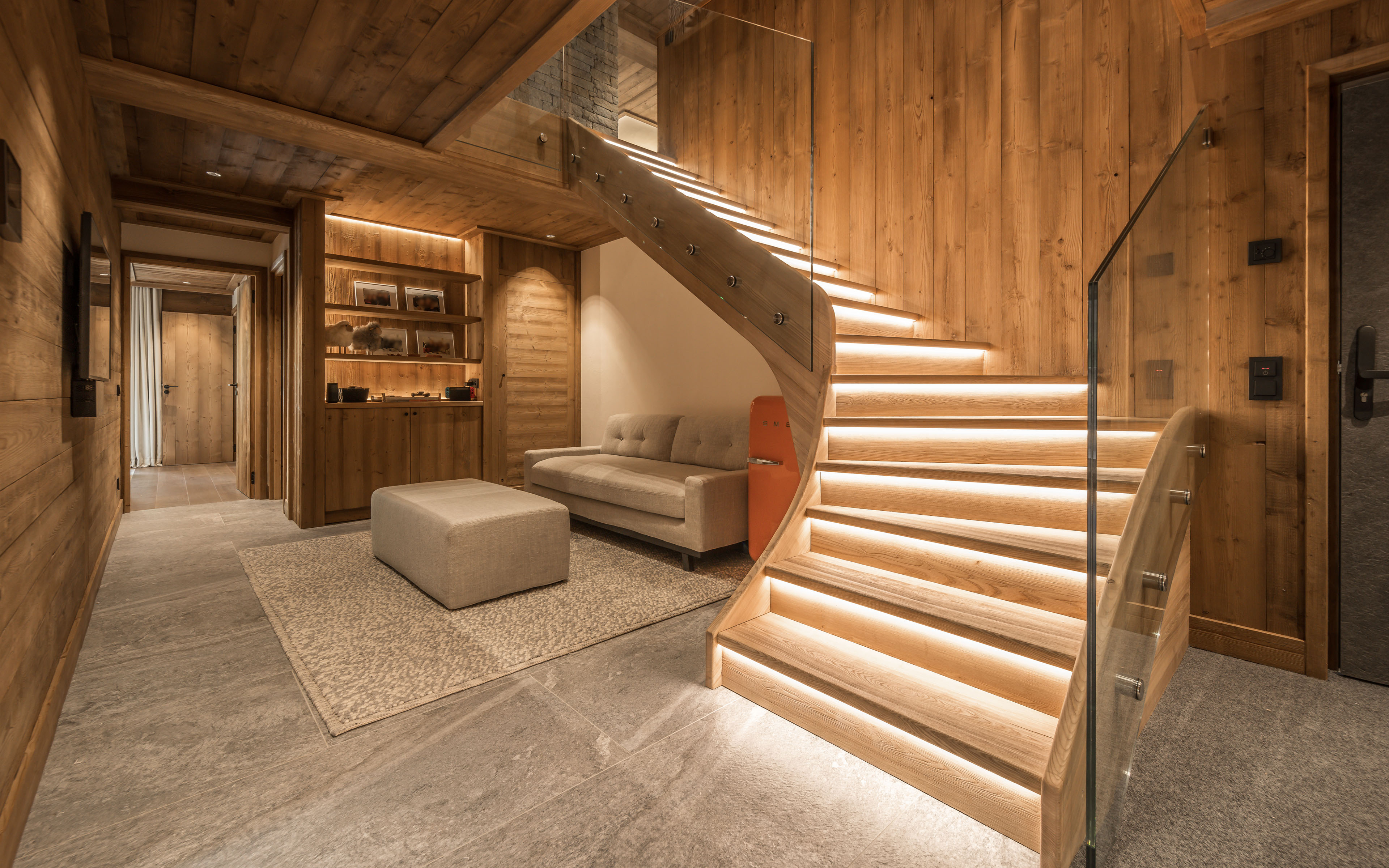 Dans la copropriété des Marmottons à Courchevel, cet appartement a été réalisé entièrement sur mesure. Que ce soit l’escalier avec éclairage intégré et verre pincé, les multiples bibliothèques, les salles de bains en pierre de luserne, la cuisine en marbre et métal, le client a exigé une cohérence des espaces/matériaux et une qualité de finition poussée pour ce beau duplex. La décoration a été confiée à Home&U.