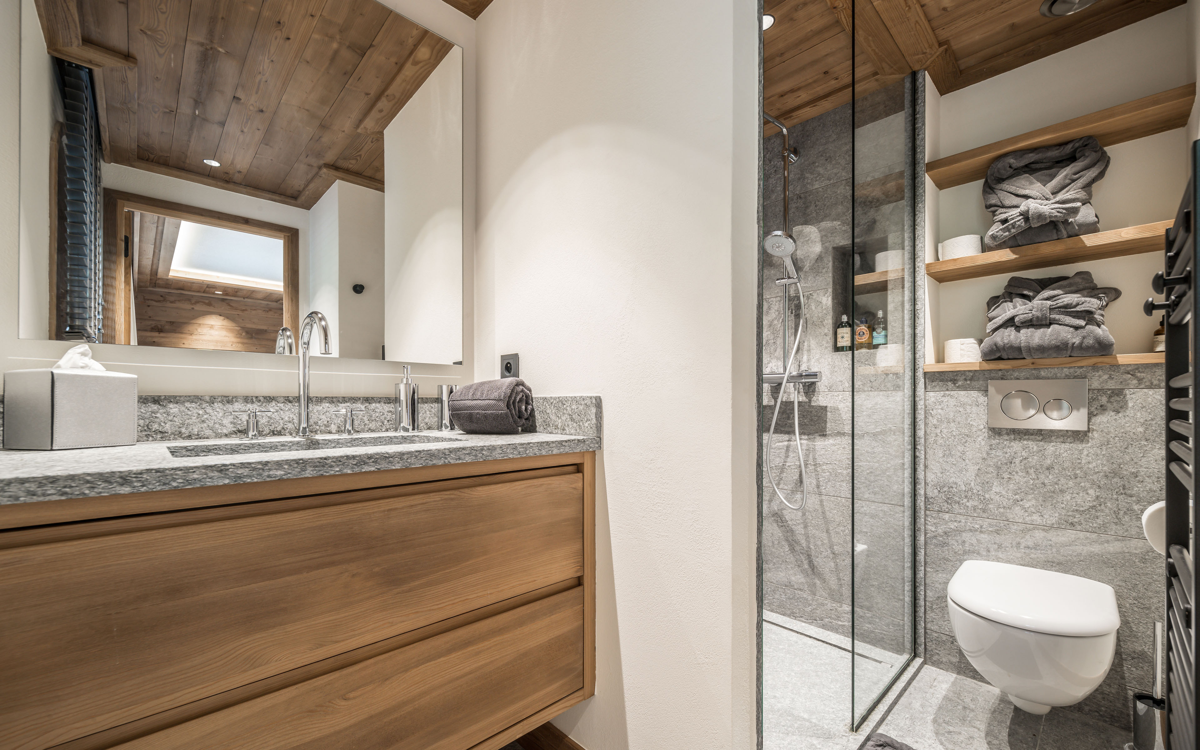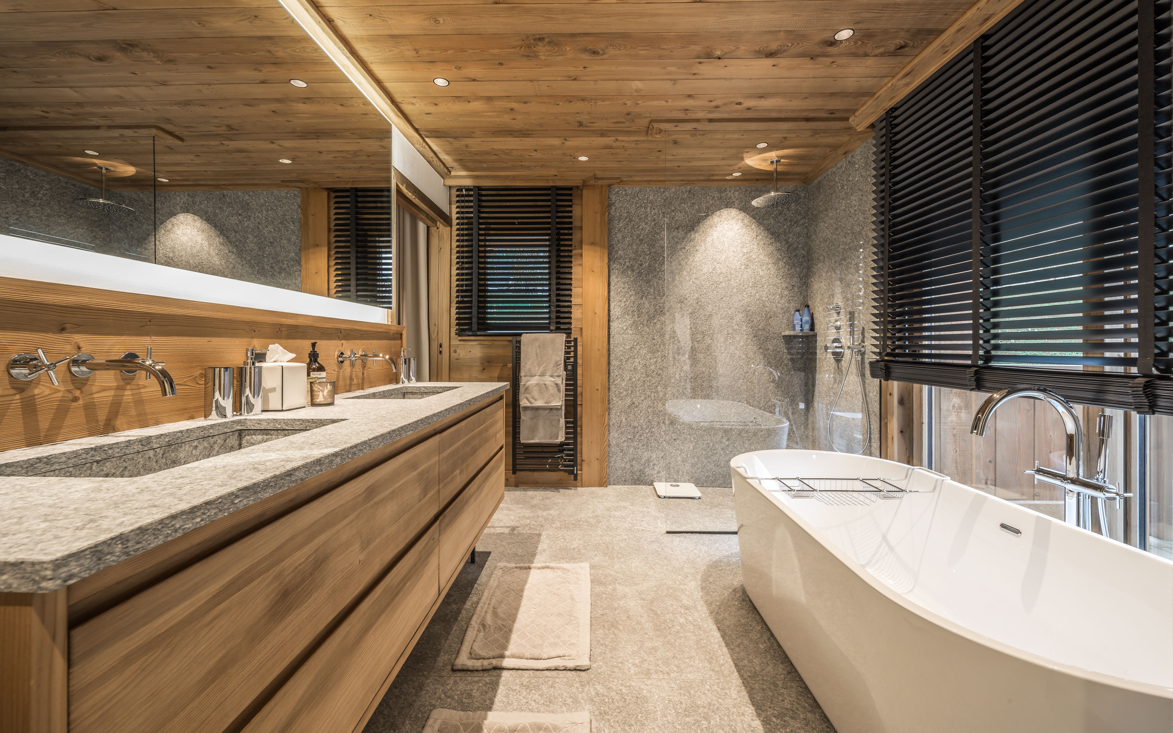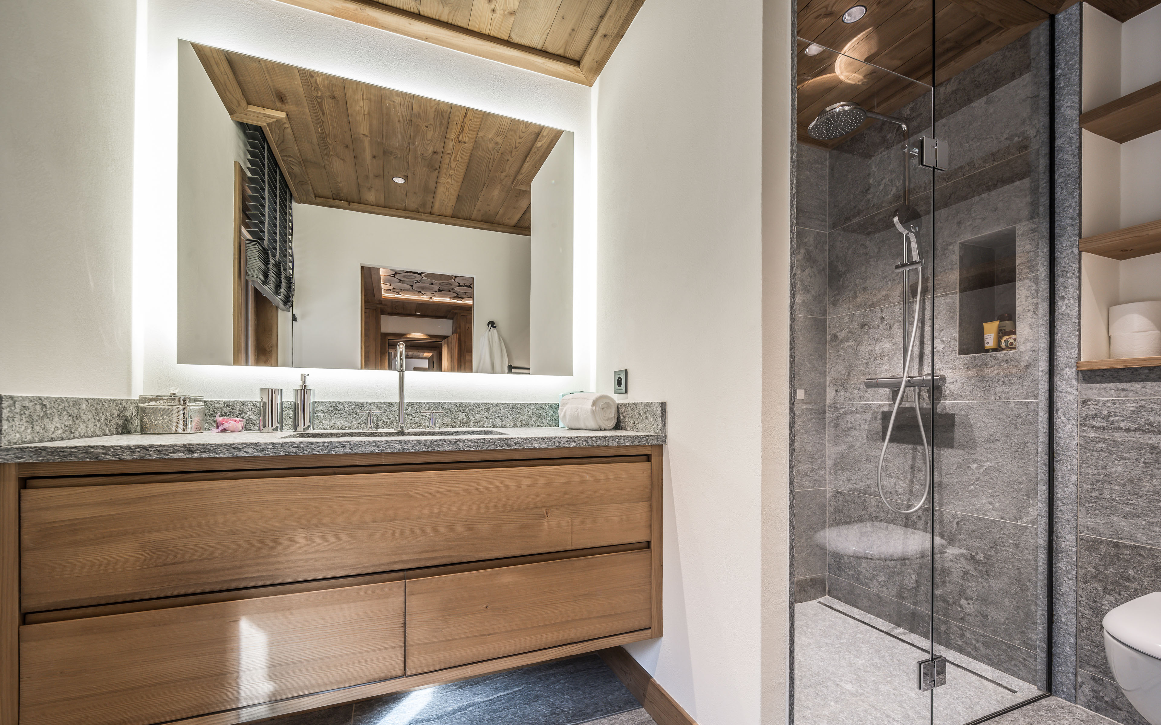 Dans la copropriété des Marmottons à Courchevel, cet appartement a été réalisé entièrement sur mesure. Que ce soit l’escalier avec éclairage intégré et verre pincé, les multiples bibliothèques, les salles de bains en pierre de luserne, la cuisine en marbre et métal, le client a exigé une cohérence des espaces/matériaux et une qualité de finition poussée pour ce beau duplex. La décoration a été confiée à Home&U.